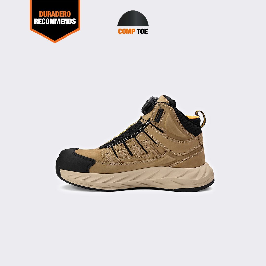 The Pro Safety Mid 6" Comp Toe Men’s Shoe in Tan is designed to combine the best of both worlds: rugged durability and the comfort of modern running shoe technology. It offers exceptional cushioning and support, keeping you agile and comfortable even through the longest, most demanding shifts. Whether you're tackling tough environments or spending long hours on your feet, this shoe provides the strength and flexibility you need to get the job done. Its advanced lace-locking system ensures a snug, secure fit that stays comfortable all day, with the added convenience of quick on-and-off. This Pro Safety Mid 6" Comp Toe Shoe is crafted to meet your most demanding tasks head-on, delivering dependable performance and comfort with every step.